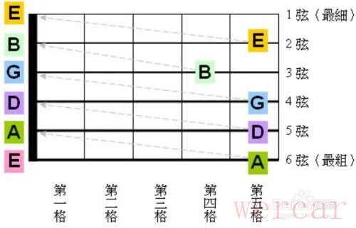 2、吉他1弦的音和同品格6弦的音一样,只是相差了2个8度,所以1弦的音可以不记。