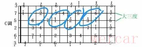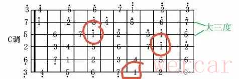 2、吉他除了2.3弦是大三度关系外,其他都是纯四度关系。以C大调音阶为例: