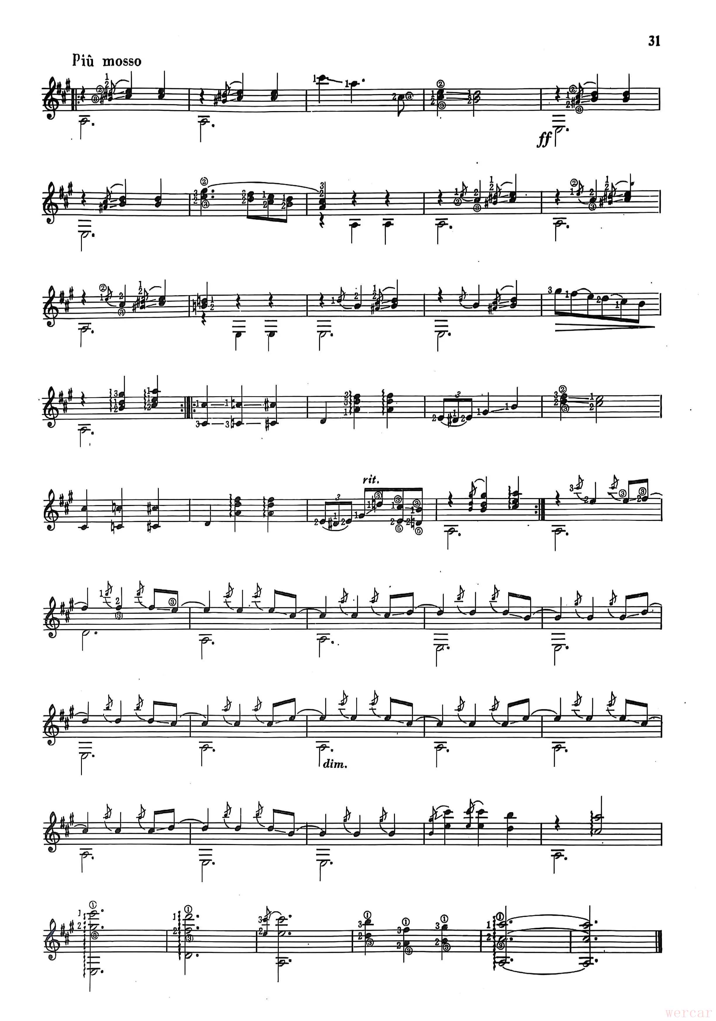 曲子属于入门至中级古典吉他曲目,适合初学者练习,也可用民谣吉他演奏。部分版本在结尾处有改编,增加了一些表现力。