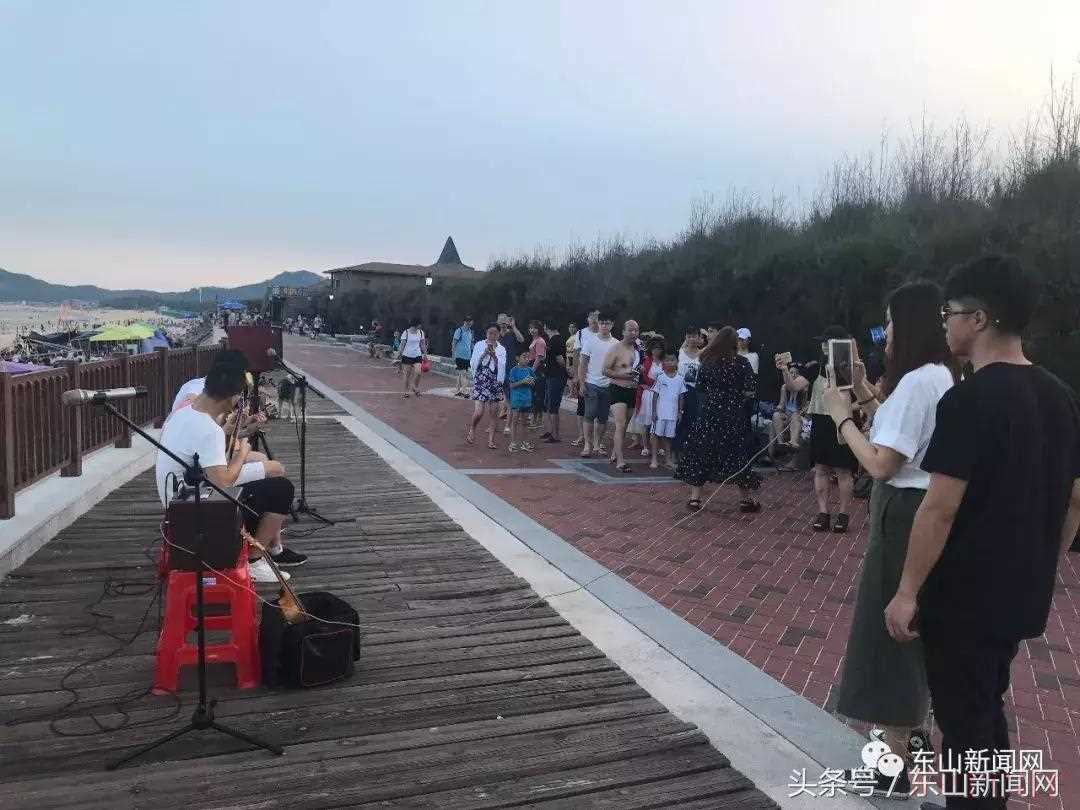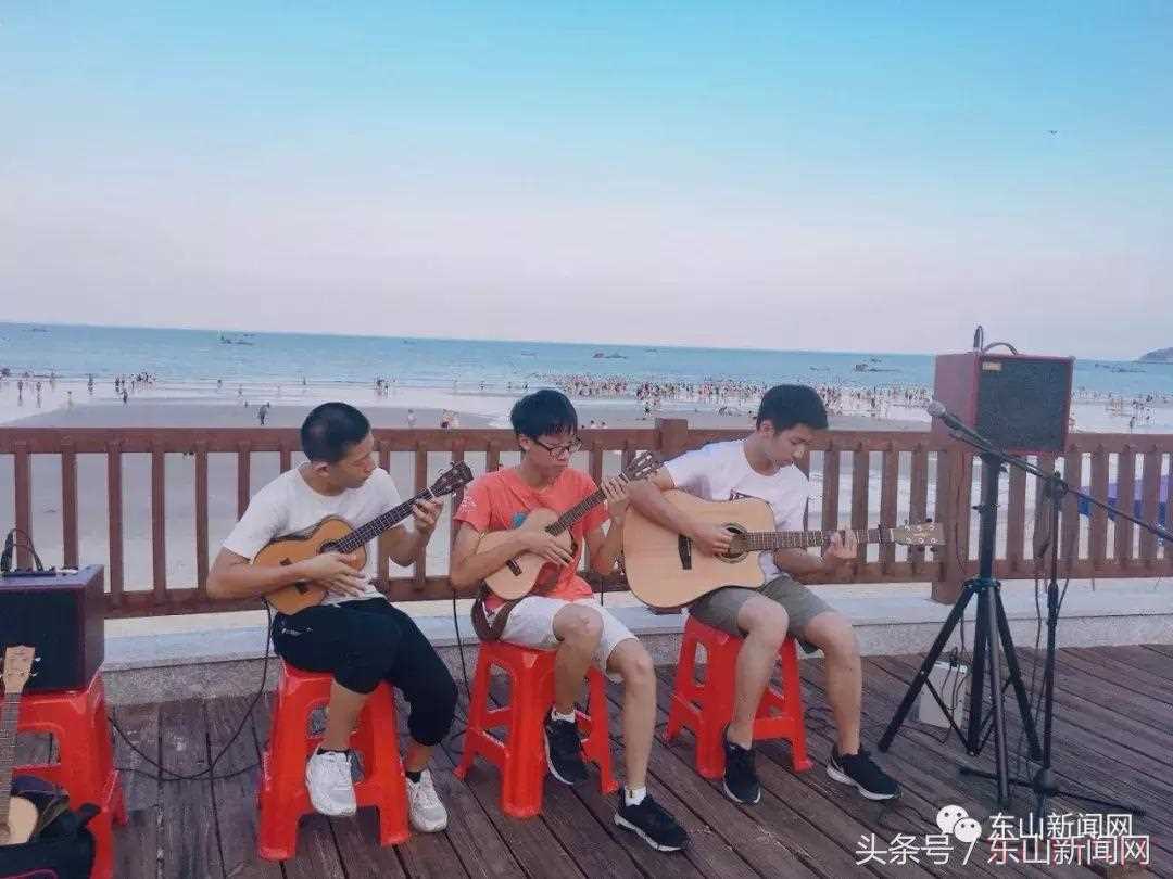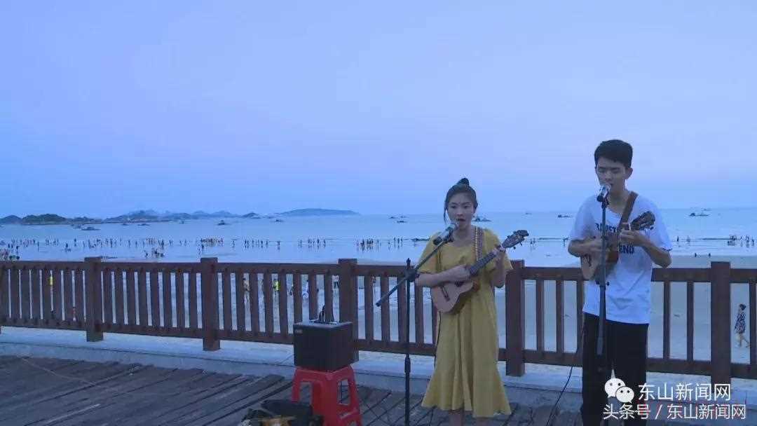 7月27-28日两天,张斌、林少琴两位音乐老师带领3名回乡大学生和7名本地的中小学生,分别在马銮湾和金銮湾两个旅游景区,进行150分钟的尤克里里弹唱,有独奏、二重奏、合奏等多种形式,面朝大海,春暖花开,浪漫的音乐引来众多游客的驻足倾听,很多游客纷纷伸出大拇指赞叹“东山岛的海边也有音乐”!