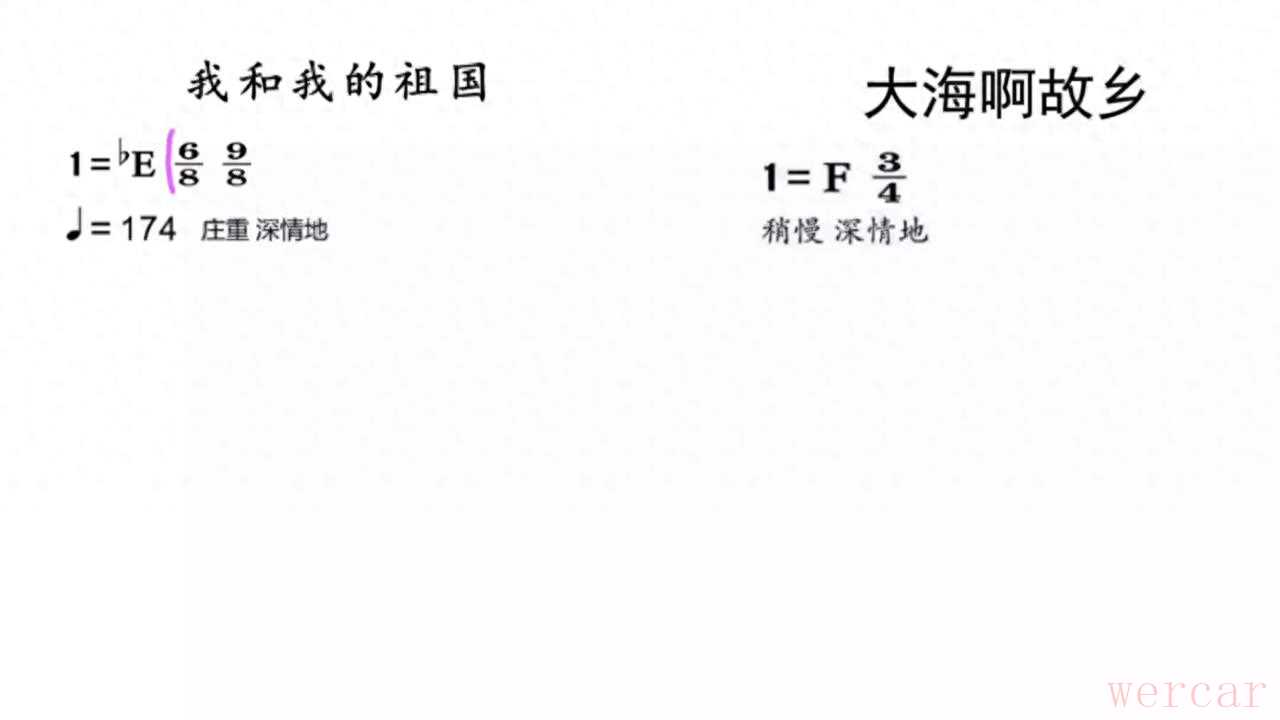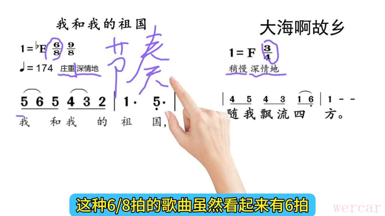 为什么这里的6/8不能约分成3/4?大家看左边的我和我的祖国这首歌,这里一个小节是6个加短线的八分音符,也就是1/8乘以6。右边大海啊故乡这首歌,这里也是6个八分音符。它们有什么不同?