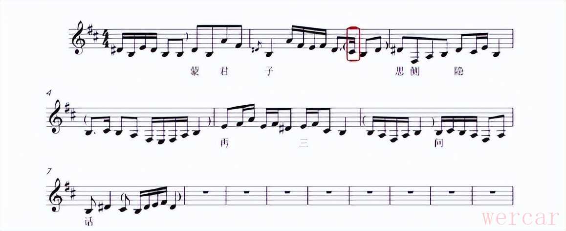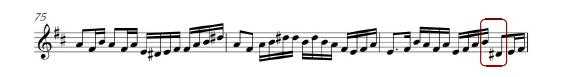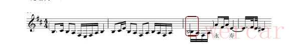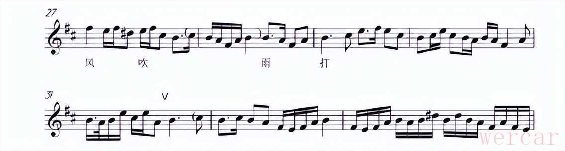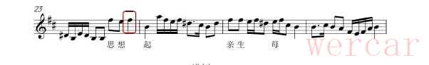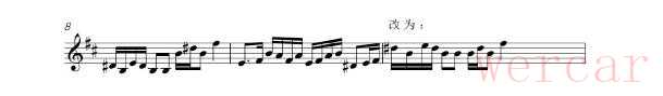 因是D调曲目,当二胡拿到曲谱时,第一步要解决乐器音域的问题。由于二胡演奏D调曲子音域为c¹—e²,而这首乐曲多次出现a、b等低音,所以比c¹低的旋律都需要翻高八度来解决,但为了与琵琶、笛子的音调相搭配,一些比c高的旋律也要统一移高八度。如:慢皮段落中,a音本需要翻高八度,但为了与其他伴奏旋律相融合,所以这一拍的音都必须翻高一个八度来完成。