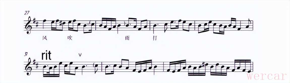 因琵琶与二胡演奏旋律一致,如何在齐奏下发挥自身特点成功脱颖而出成为伴奏的一大特点。主要是通过添字加花的方式,一般出现在旋律简单且音符时值较长的地方。为突出拉弦乐器,弦乐拉奏四分音符,琵琶将四分音符改成叠音效果的两个八分音符;或是改为附点音符与两个八分音符;或采用级进的方式,在主干音的上下方进行变化。