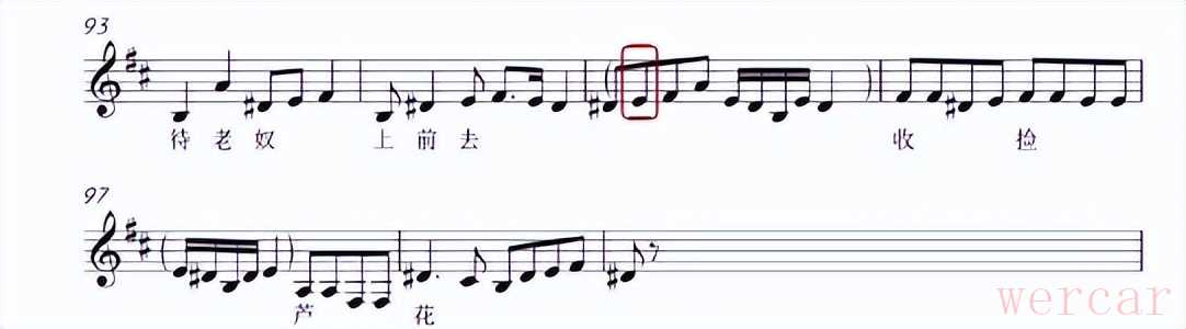 在吊板中,琵琶与二胡演奏长音,笛子作拖腔处理,笛子的部分重复前一拍的旋律,唱腔后接高八度的音,旋律起伏大,推动故事情节,同时也为旋律起到承上启下的作用。