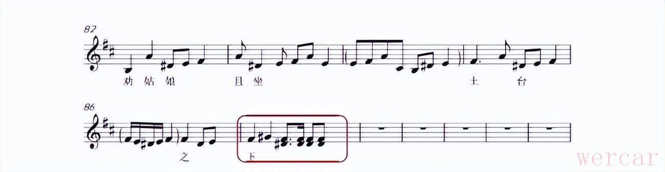 慢皮段落中,唱腔紧接过门,谱面上标有明确的气口,表演中唱腔速度快,这里的气口起到承上启下的作用。演奏时以一个强有力的呼吸接过门,过门速度由慢逐渐加快,若此时没有气口加入,连续的十六分音符会造成肌肉紧张,产生音色偏硬的效果。