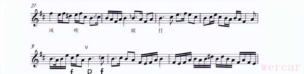 在强弱处理上,唱腔在行腔时,节奏鲜明且抑扬顿挫,附点节奏明显强调晚一点在出来。琵琶在伴奏此旋律时要紧跟唱腔,与唱腔气息共进共退,以强收住,另起时弱进后逐渐渐强,在力度上对比变化、旋律上构成起伏,从而扣人心弦。