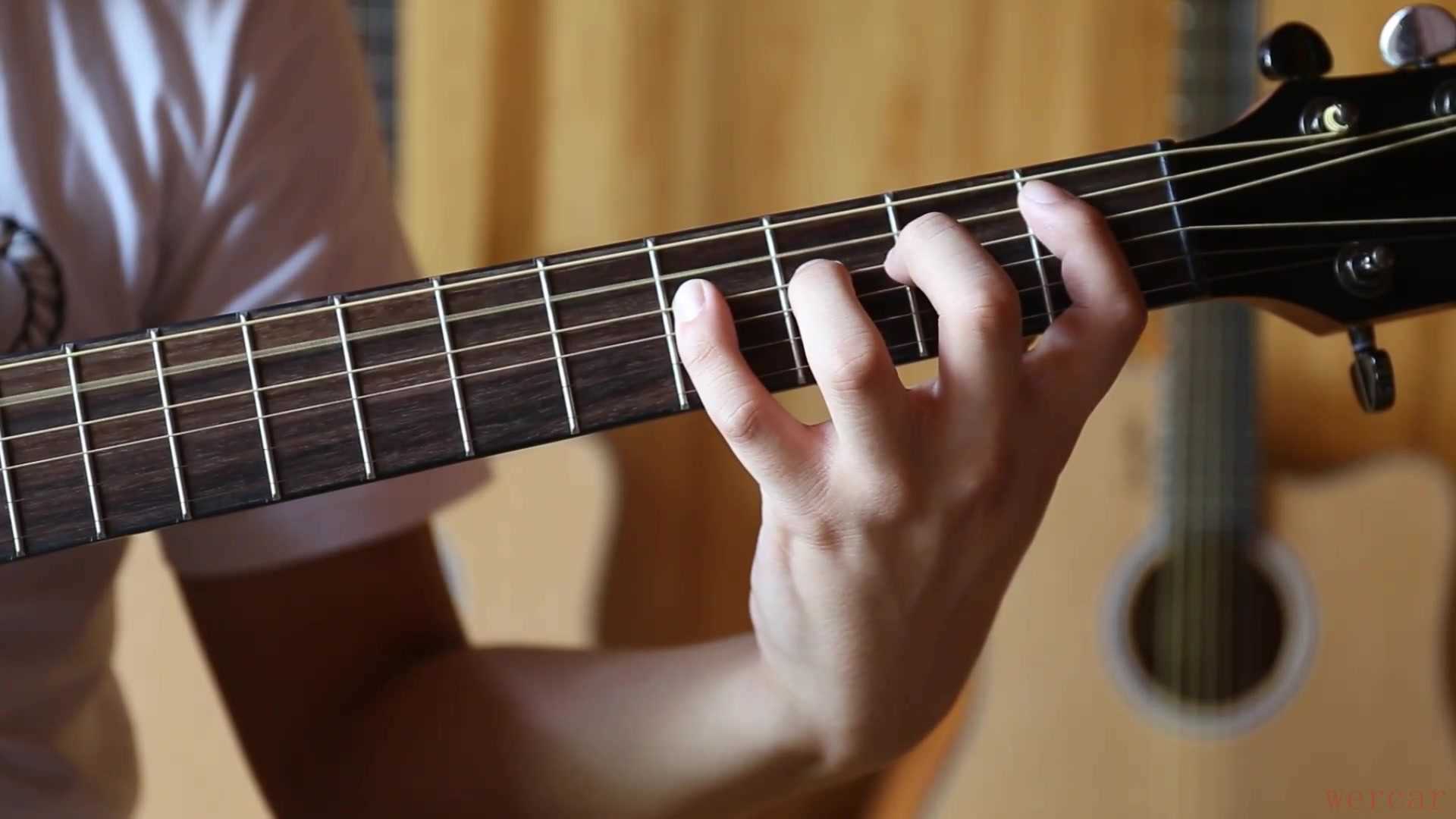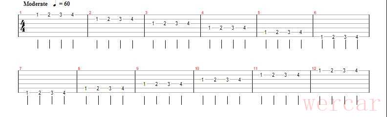 五、练习时,如果1-4品太宽,可以从3品开始,每个练习顺序从1弦到6弦,再从6弦回到1弦,这里先不变品,值得注意的是,你左手手指每一次的移动应当是保持直线移动,一定要崩住手型,这样才能锻炼左手肌肉和韧带。