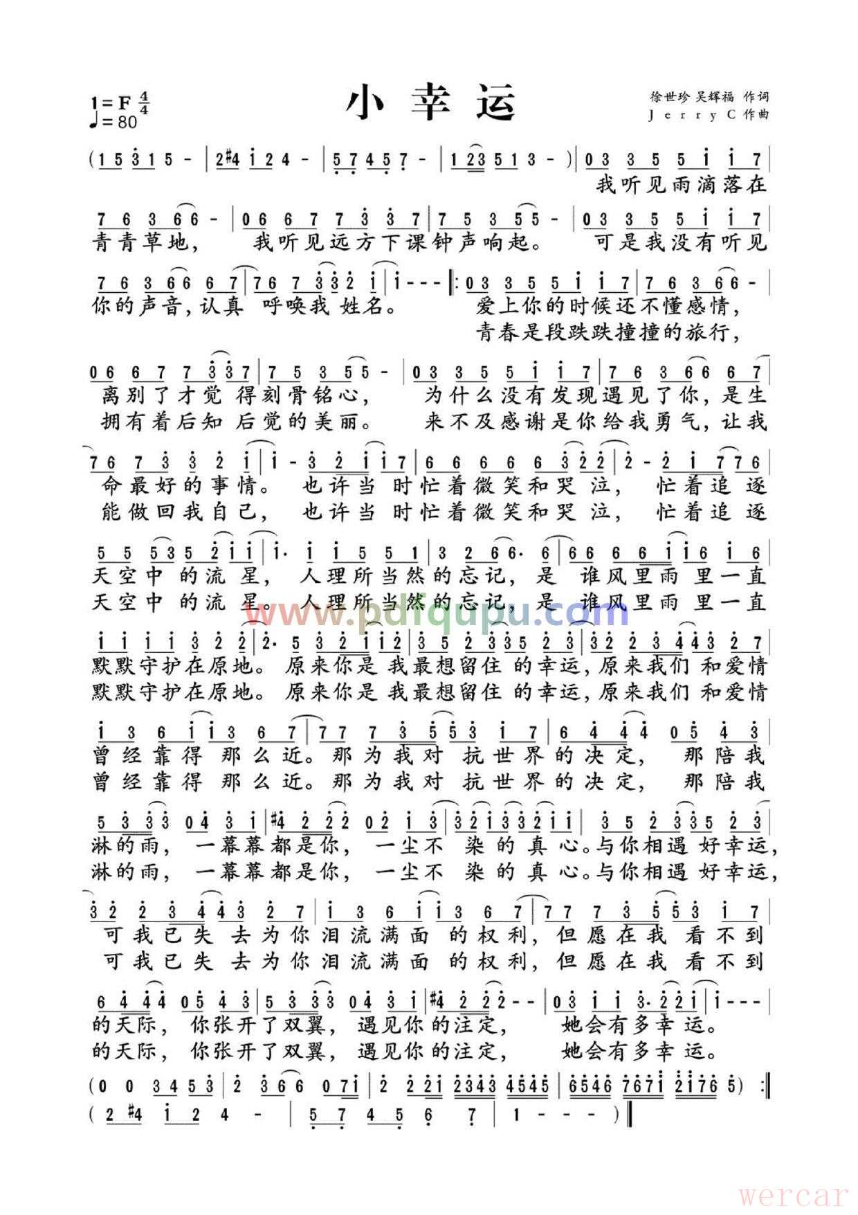 这是《小幸运》的简谱,调性为F调(4/4拍)。