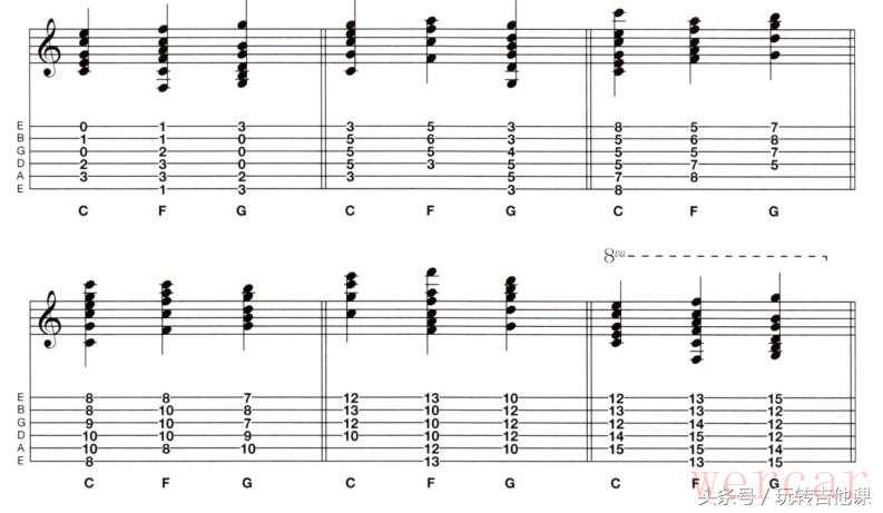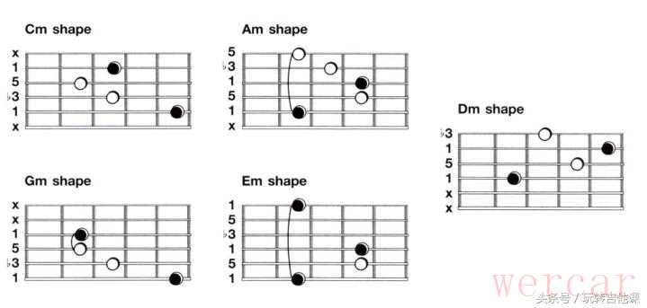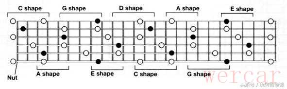 其实CAGED系统就是建立在五大和弦(C、A、G、E、D和弦)的基础上,每个和弦指法都可以在指板上的任意位置弹奏,只要找到根音平移到对应的位置就可以了,这样子你就可以用一个和弦指法弹去12个调。