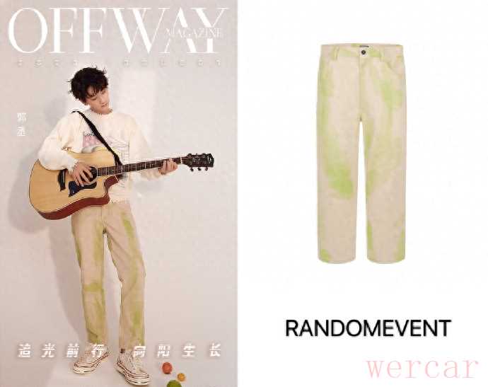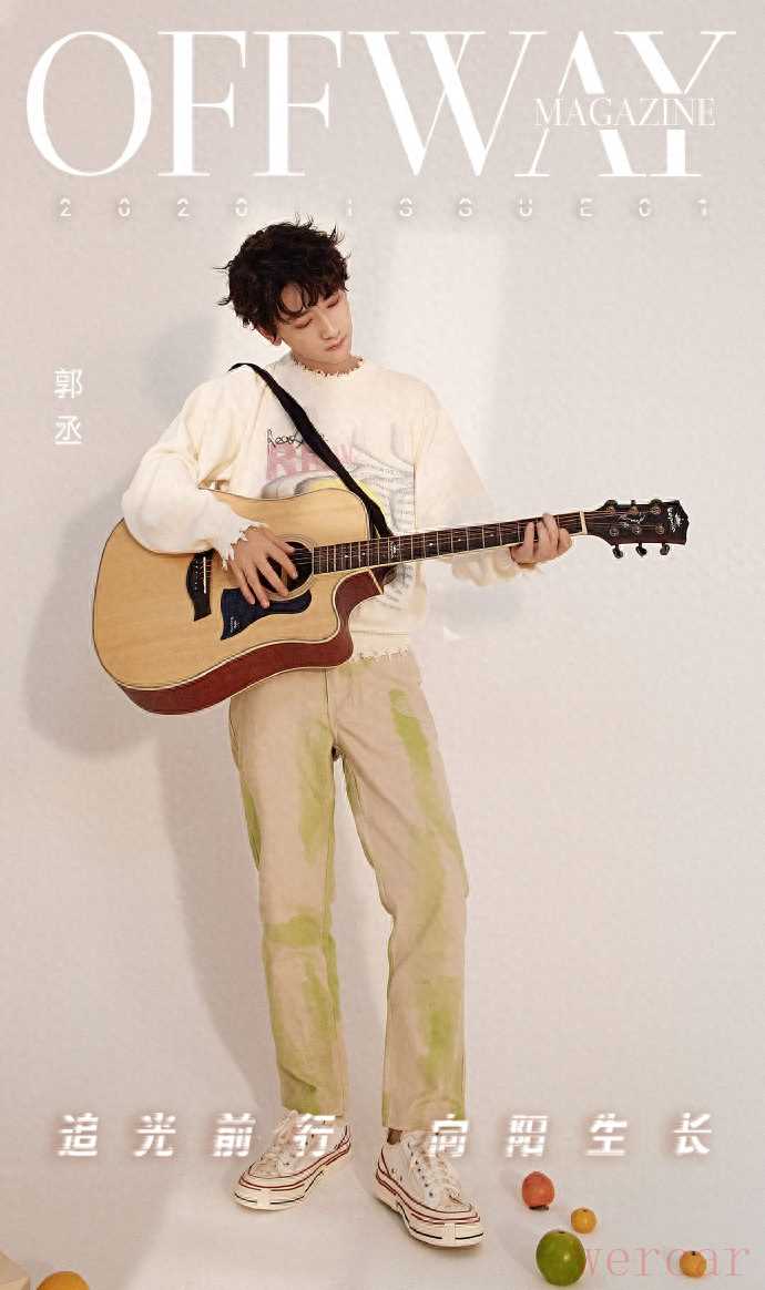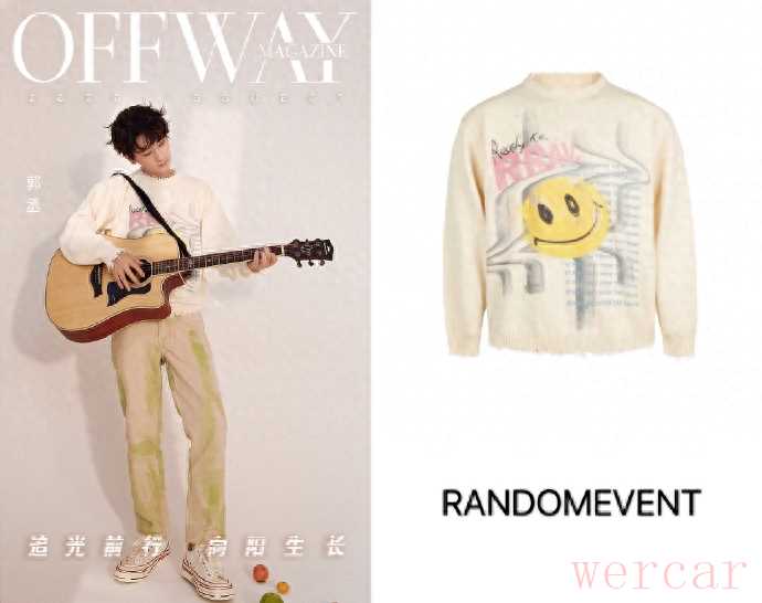 邂逅阳光的「吉他少年」。郭丞身穿米色针织衫,给人一种温暖的感觉。胸前的涂鸦元素和领口、下摆的仿破坏工艺,又多了玩味个性。