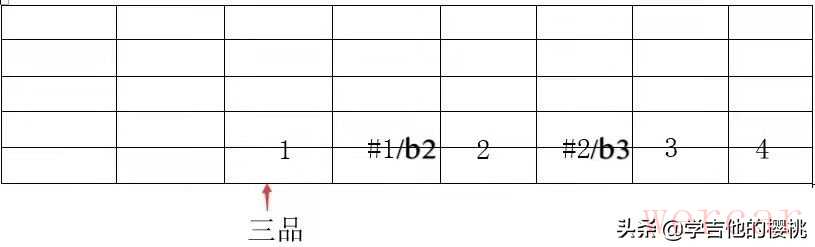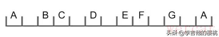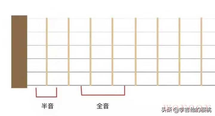 在吉他学习中,同一根弦相邻的两个品格相差半音,相隔一品为全音。如图所示: