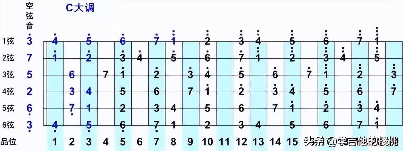 所以记住吉他指板1弦到6弦空弦音分别是:E/B/G/D/A/E (高音3/7/5/2/低音6/低音3),那么看似复杂的音阶图也不难推算。