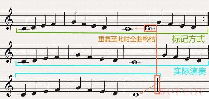 比如说第一遍奏完需要重复,在重复第二遍的时候到“Fine记号”处就表示全曲完结了。