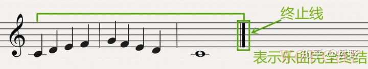 终止线是代表全曲“曲终”的线,由一粗一细两根纵线构成,是表示曲子完全完结的符号。