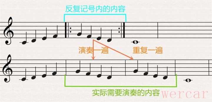 遇到这种反复记号意味着记号内的小节段落需要演奏两遍。