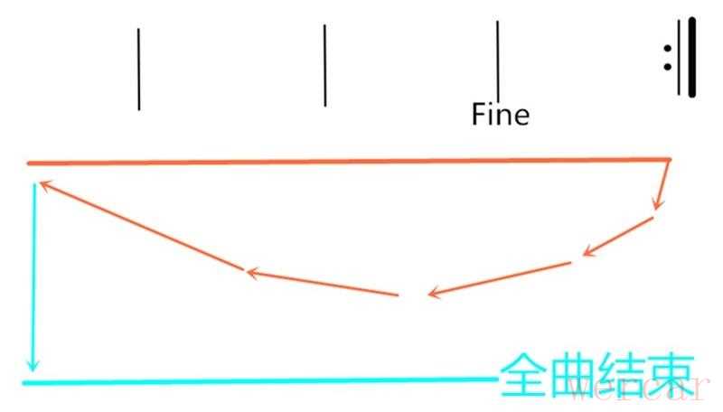 在重复时遇到“Fine记号”就意味着:整首曲子重复到此处时完结。