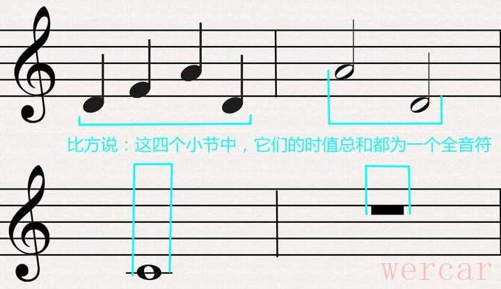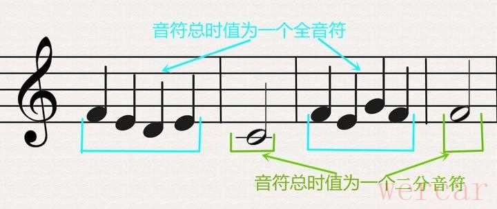 通常在一张乐谱中,每个小节的音(包括休止符在内)的总时值都是相同的。