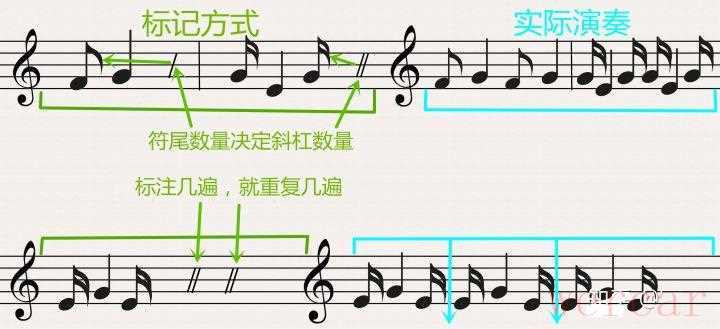 旋律反复记号“/”是用来标记小节内旋律的反复记号,如果在一个小节内有重复的旋律就可以使用“/”来标记。通常“/”的数量与音符的符尾数量相同,“/”标注几遍就重复几遍。