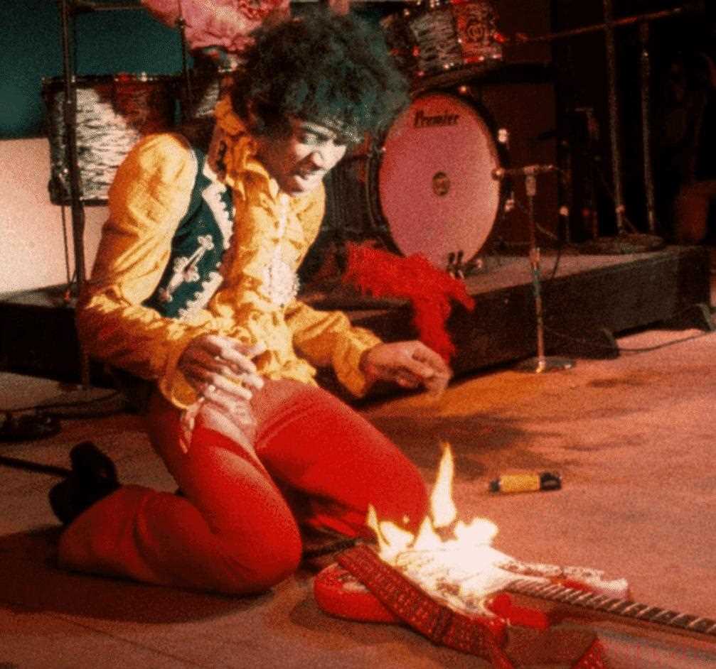 被 Jimi 烧毁的 Fender Strat"我们做的下一件事是在标准款 Jem Universe 的琴身上撒上矿物油,然后小心翼翼地开始燃烧它,以模仿 Jimi Hendrix 吉他的外观。这就像一个家庭烧烤!我们有一群人围着它,正在对它进行进行烹饪"。