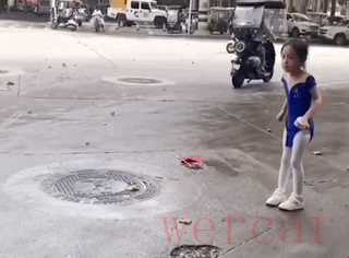 发现国旗掉落在地,小女孩赶紧跑过去,小心翼翼地弯腰捡起。