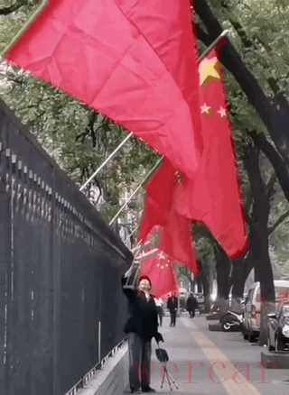 街头悬挂的国旗缠绕在旗杆上,路过的老人见状,踮着脚用拐杖将其展开。