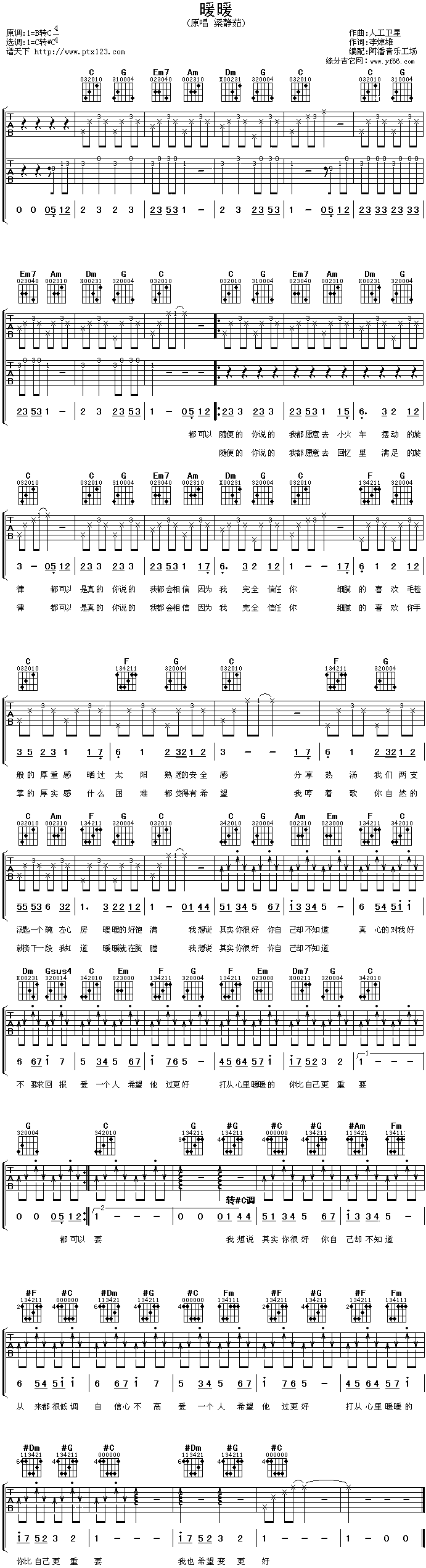 - 《暖暖》通常使用C、G、Am、F等和弦,要注意和弦的转换流畅自然。