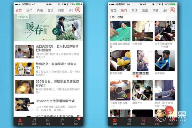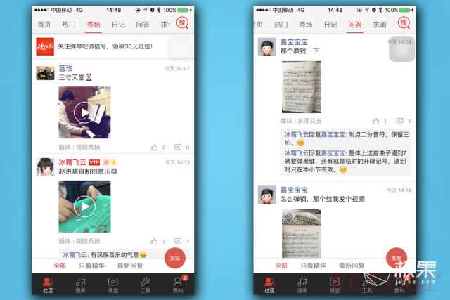 弹琴吧以社区的形式向用户提供了一个交流吉他的地方,一些优质的帖子被优先展示在社区的首页中。在热门中包含了网友们的原创视频,秀场和日记类似于朋友圈一样的形式,用户可以分享自己学琴的状态和自己的表演。问答和求谱则为琴友提供了求助的地方,曲谱和问题都可以在相应版块求助。