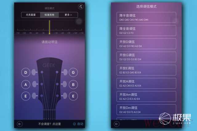 在其右上角有非常实用的调音器功能。为什么需要调音器?因为并不是所有的吉他都是1E,2B,3G,4D,5A,6E的传统模式。有的曲谱为了更加便于弹奏需要改变调弦模式,而Geek智能吉他提供了全面的调弦模式,方便调弦。