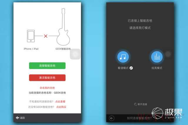 GEEK智能吉他创造性地开创了自学吉他的模式,通过LED亮灯的形式来显示对应的指法。开启电源的智能,连接“弹琴吧”App,选择相应曲谱即可同步练习。