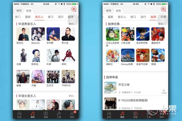 弹琴吧的谱库内置钢琴和吉他的曲库,流行的,指弹的,古典的都一应俱全。常见的热门和最新曲谱被优先展示出来。为了照顾新手,弹琴吧还特开了练习的版块。每一个版块中,一些热门的曲谱和歌单都被优先展出出来。