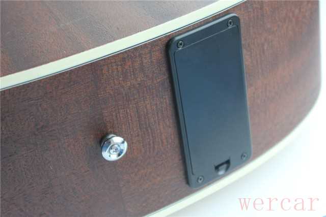 在吉他的底部还有一个小铁帽,用于固定背带。在底部还有电池盒,用于存放电池。