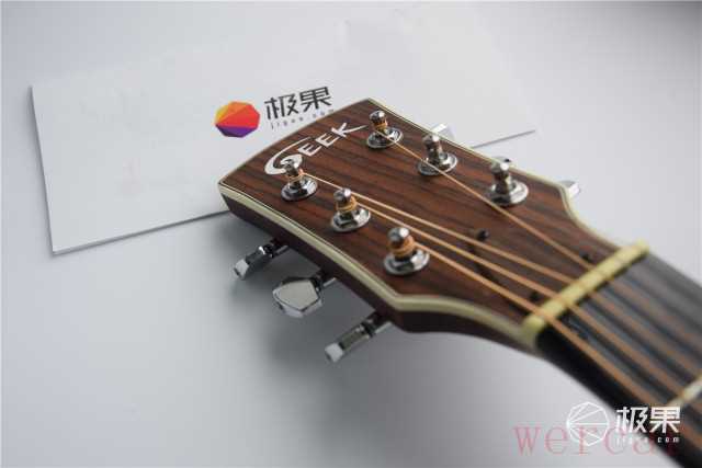 Geek智能吉他琴头上“GEEK”的Logo清晰可见。琴钮扭动顺滑,便于调整琴弦。在出厂时,琴弦均已做了音调校准,免去了自己调整的麻烦。我拿到手时候,经过试弹,每个音调都很准。
