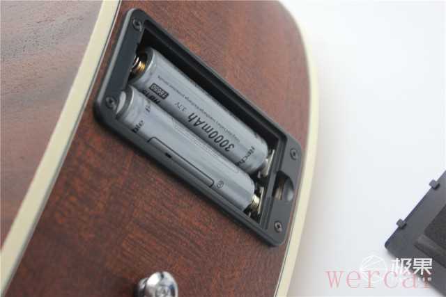 打开电池盒,可以看到Geek智能吉他在出厂时已经内置两颗可充电的电池,每颗电池为300mAh。