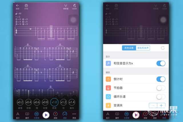 当使用者第一次练习曲谱,面对复杂的和弦转换,用户很可能被变换莫测的LED灯光搞晕。为了方便学习,Geek智能吉他可以控制播放速度,调慢和加快速度。同时也提供一些如节拍器,倒计时等其他设置,对于一些需要变调夹辅助弹奏的曲谱,也可以通过加高调子实现LED灯光正确显示。经过测试,由于本身不附送变调夹,对于一些原本高品位的曲谱却无法降调,只能升调。看到一些曲谱写着“变调夹夹二品”,如果你没有变调夹想要通过可视化学习就基本不可能。
