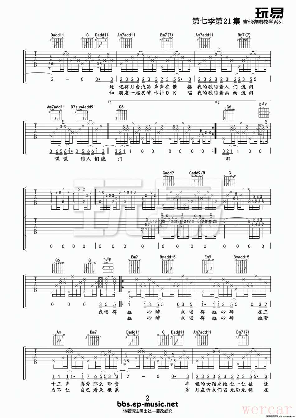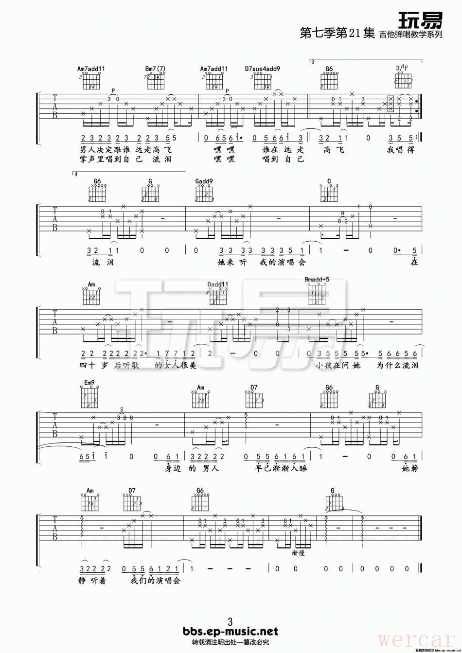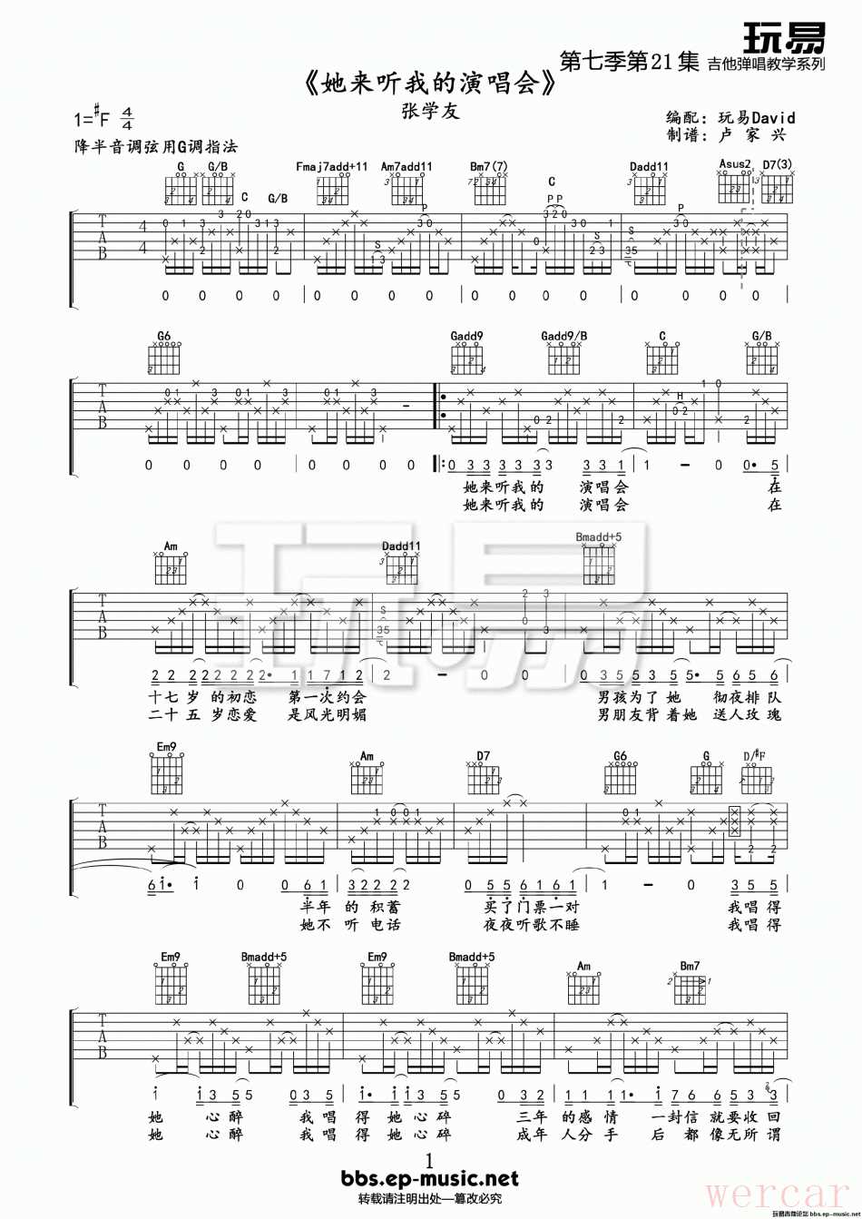 最后附上《她来听我的演唱会》吉他谱,这份谱子是在玩易吉他上找的。在王鹰的考级教材里我记得好像是十级难度的曲目吧。希望琴友们朝这个方向努力。