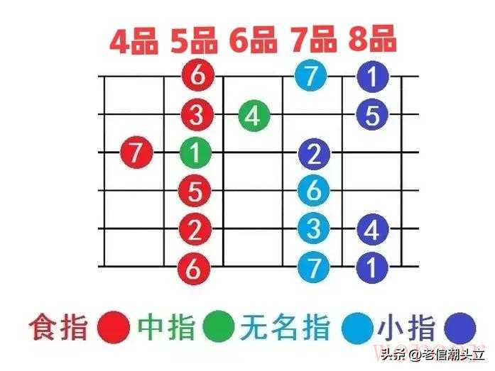 等这两个指型熟了,再学其他指型,换不同调练习,因为音程规律不变,只是音阶起点位置不一样,到时候就会发现“原来记音阶这么简单”。