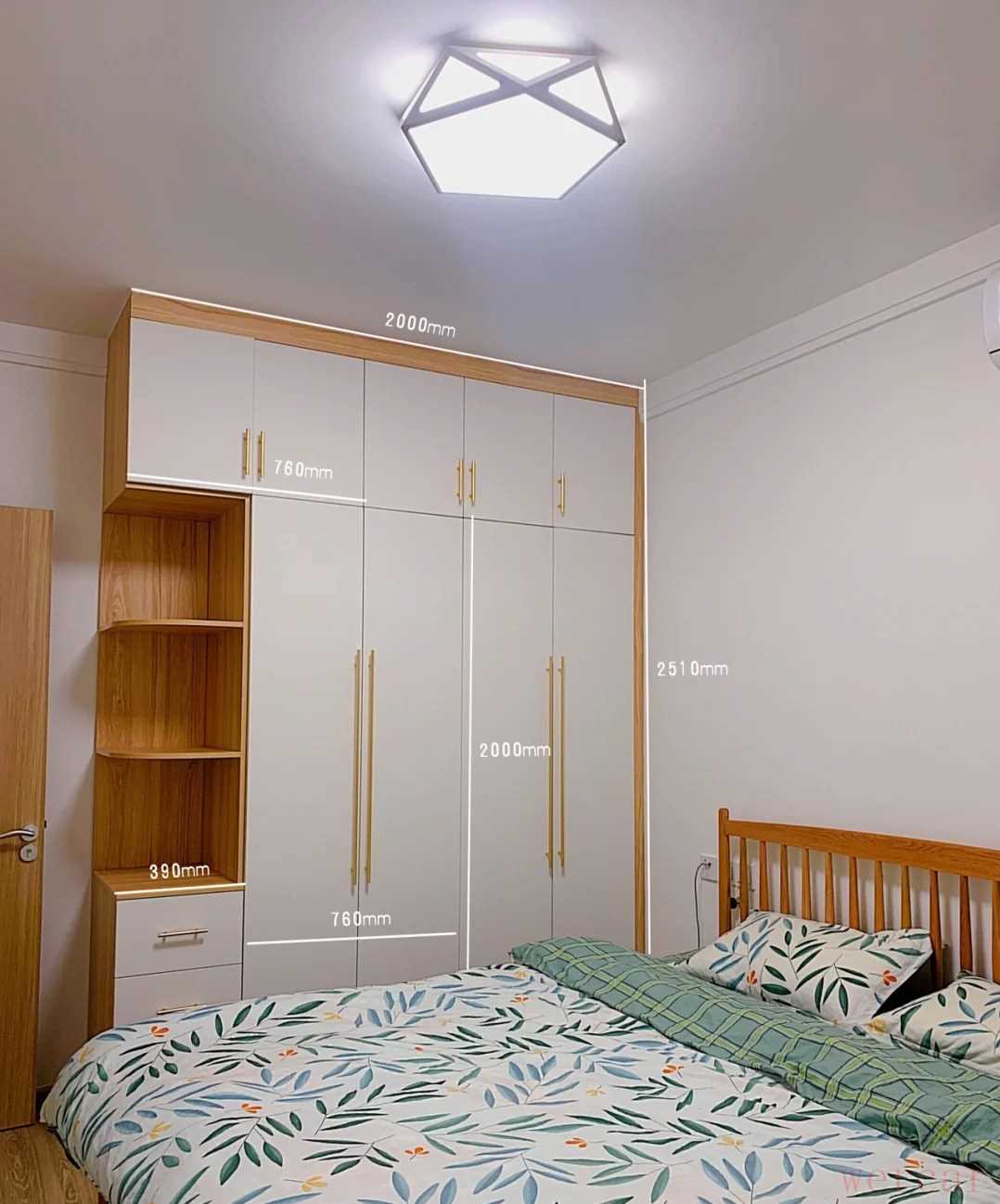 主卧的布置也是很简单,采用双层石膏板吊顶,显得房间又大又宽敞,大白墙搭配原木家具及花纹床品,干净清新又自然,靠墙做了一个衣柜,同样以白色和原木色为主,与室内风格很协调,柜子侧面额外做了一列开放格,用来当成展示区使用。