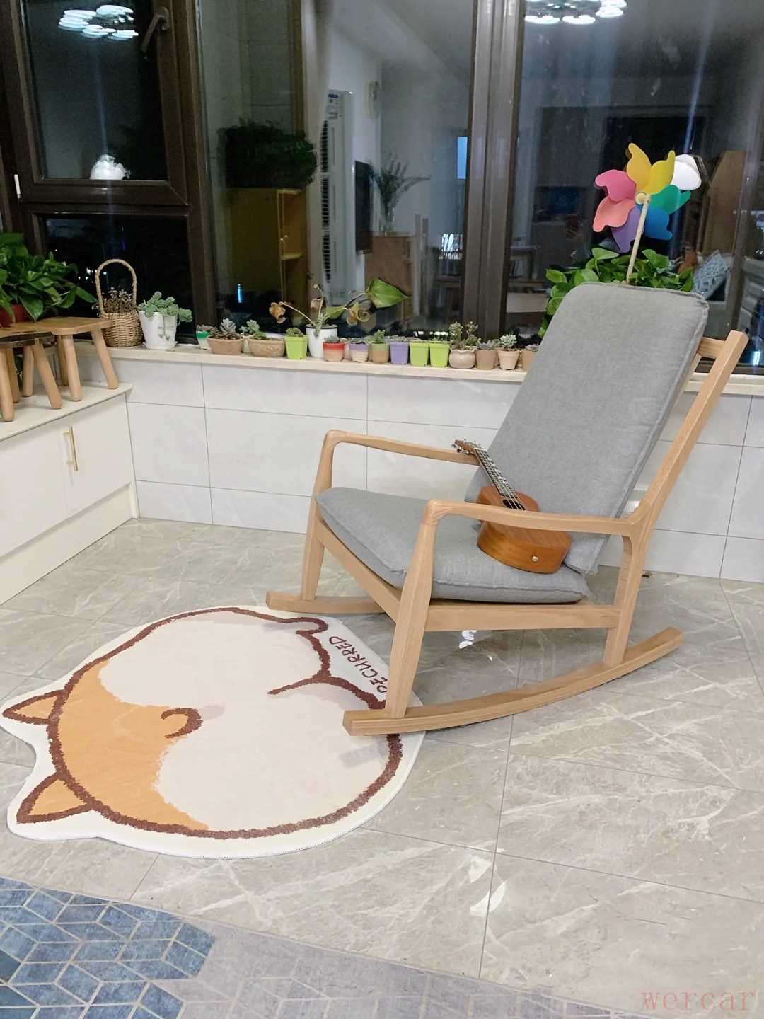 阳台既是晾晒衣服的地方,又是休闲区,晚上坐在懒人椅上弹弹吉他,便能忘却一天的忙碌与劳累,彻底的放松自己,地上铺着一张柯基图案的地毯,相当可爱、温暖,缓解了瓷砖的冰冷感。