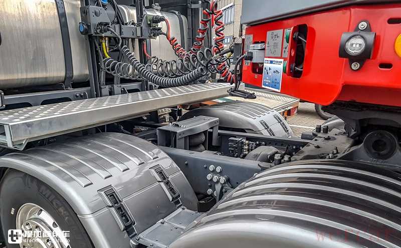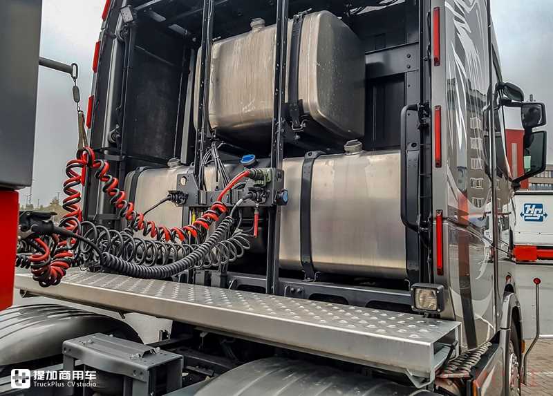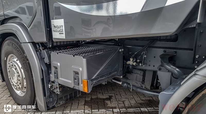 底盘两侧设有电瓶以及满足欧六排放标准的后处理系统,这两大部件同样在物流运输车辆中普及使用,模块化设计理念极大降低这类专业运输车辆的生产周期。