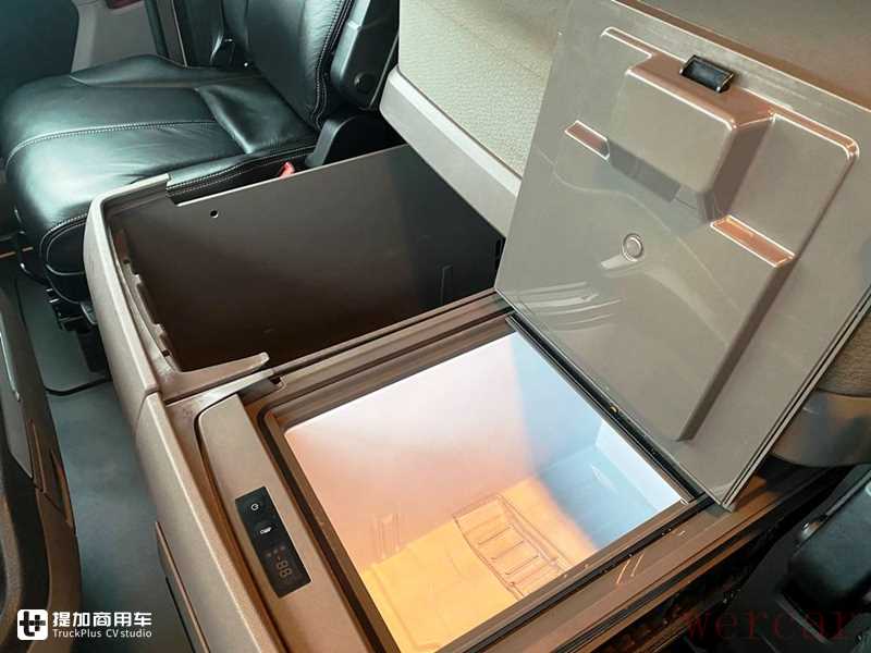 宽敞的平地板空间除了提升有利活动空间外,还可以为卧铺下方装配大容量储物格、冰箱,带来诸多便利,原来大件运输车辆也可以如此奢华、豪横。