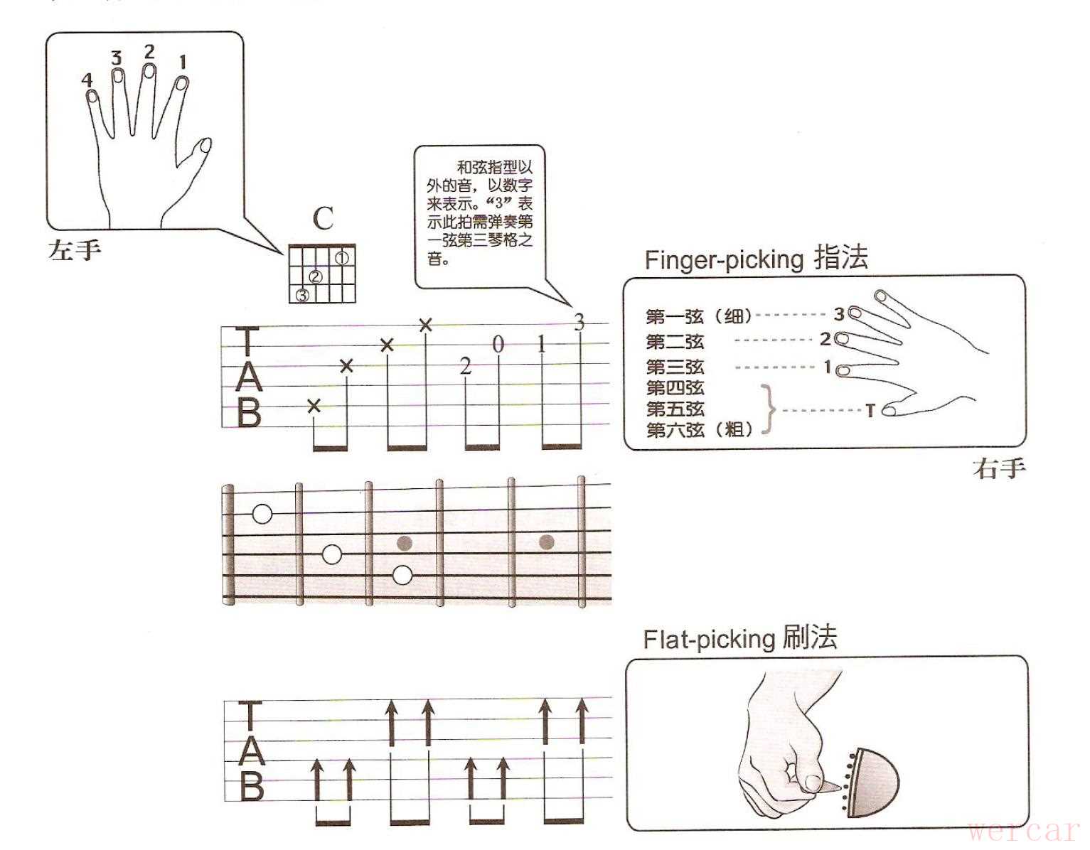 在吉他的弹奏上,一般来说分成二种演奏形式,一种是叫Flat - Picking (刷法或扫弦),另外一种叫Finger - Picking (指法)。Flat - Picking 的弹法是使用Pick(请参阅本书第十章)在弦上做弹奏,而Finger - Picking 则是使用手指在弦上拨奏,二种演奏形式在谱上各有不同的演奏记号,你必须都要知道,这样有助于你更快看懂吉他套谱。#吉他#