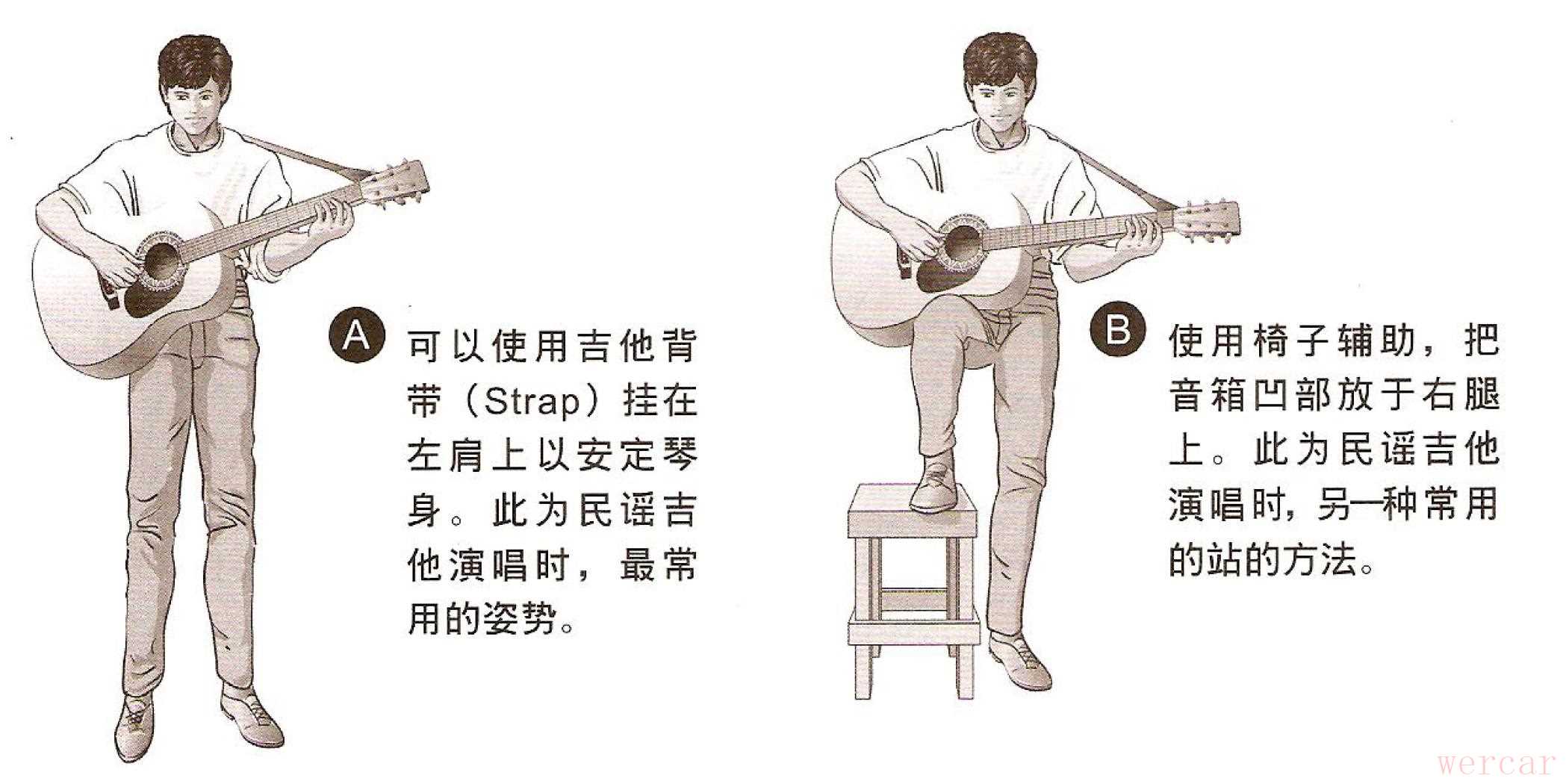 不管你弹奏时使用的是何种姿势,都请注意,小手臂不可紧贴在吉他面板上,应该保持可以自由挥动的空间,身体的胸部也不可以完全紧贴(只能轻靠)在吉他的背板处,因为吉他的共鸣都是靠这上下的木板所产生的,紧靠的结果将使吉他的声音变得“闷”而且“短”。