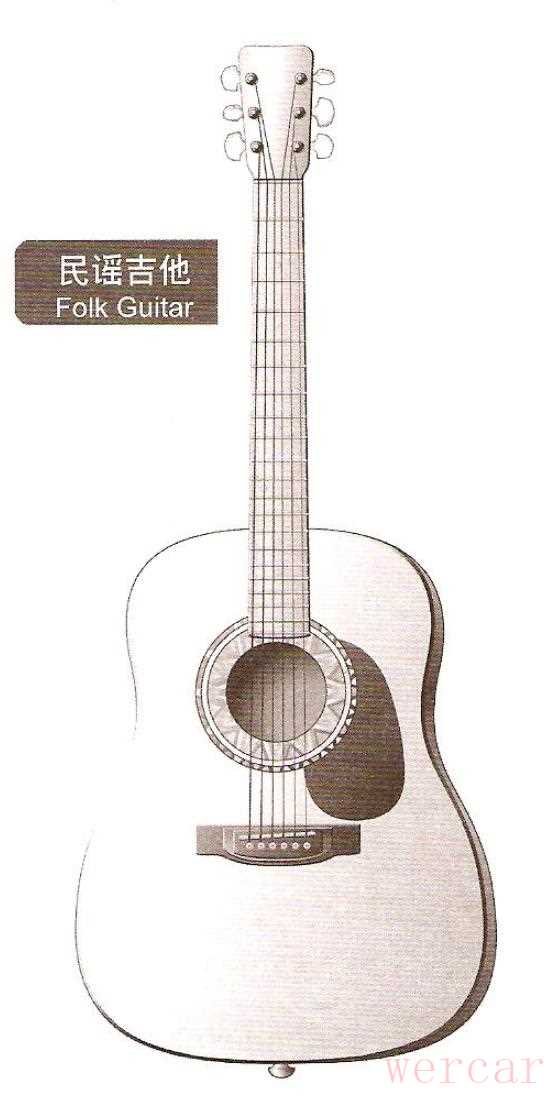 多使用于民谣歌曲、摇滚乐、蓝调音乐、爵士音乐等形态之音乐中,俗称为“空心木吉他”。音色明亮也较具现代感。亦有人在吉他上装置可扩音之拾音器,俗称“电木吉他”,亦或在吉他之高把位处,制作成圆弧凹角,俗称 Cut-way (缺角)型木吉他。