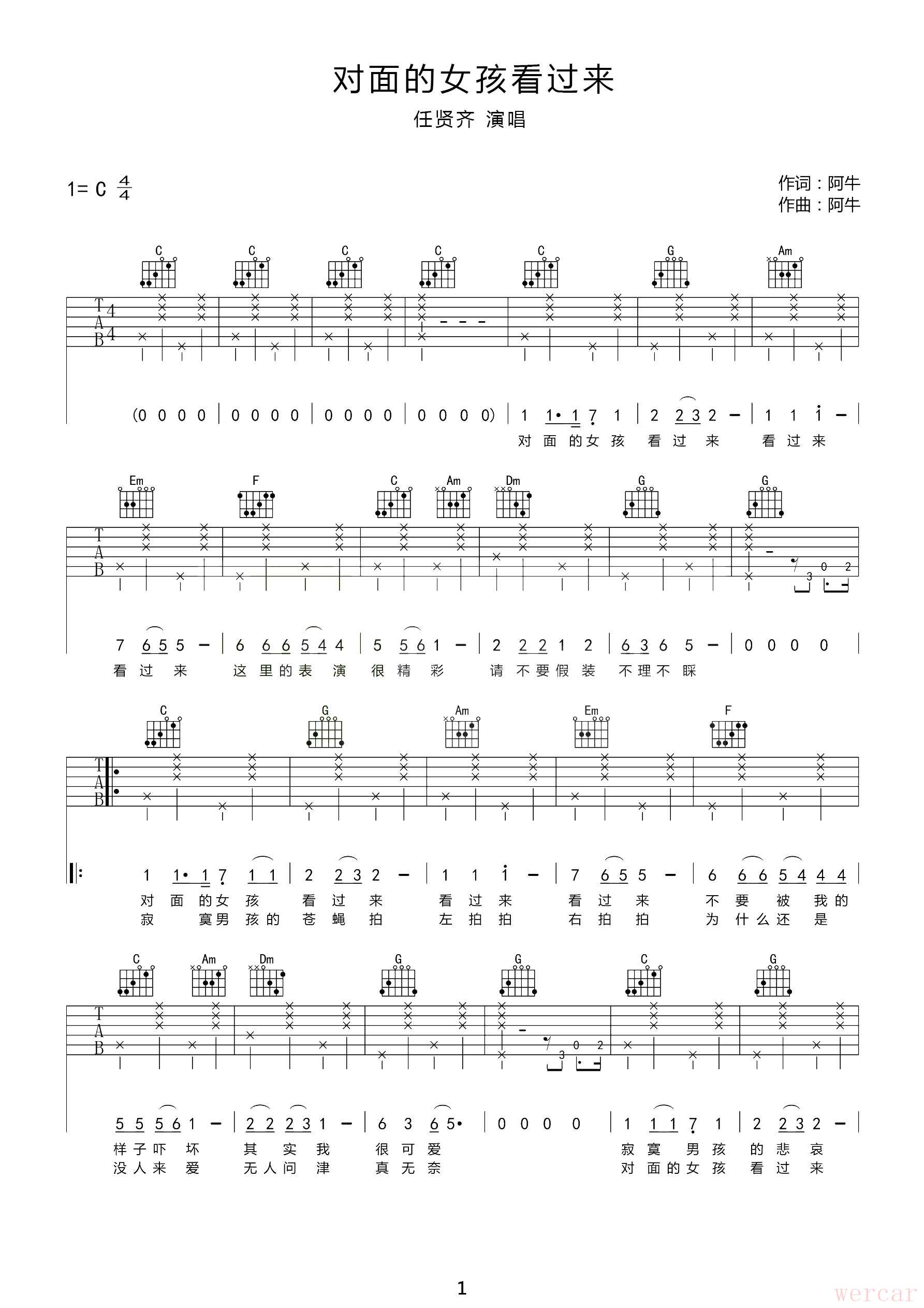 各位热爱音乐和吉他的朋友们,可以对照谱子和音频来演奏。以下是任贤齐的《对面的女孩看过来》音频欣赏: