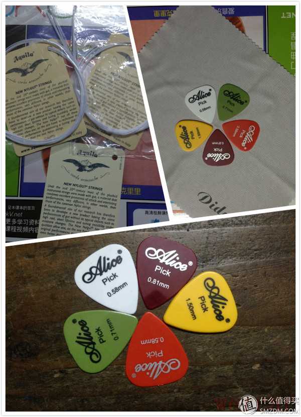 Aquila的尼龙弦,手感不好,之前199买的沙比利木烧火棍就是Aquila,感觉硬而且涩,也不知道琴上装的是什么牌子的弦,但是按上去感觉弦很软,按得很舒服,在这里想向有经验的琴友讨教个问题,很多网友都用worth碳素弦,和尼龙弦手感上有什么区别呀?还有擦琴布和Alice五颜六色各种size的拨片。可以召唤神龙了哟。