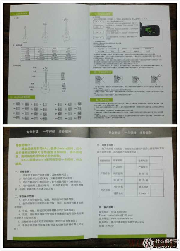 产品说明书:介绍了ukulele的尺寸,琴的部位名称,和弦表,调音器的用法,换弦的方法,保养,blablabla