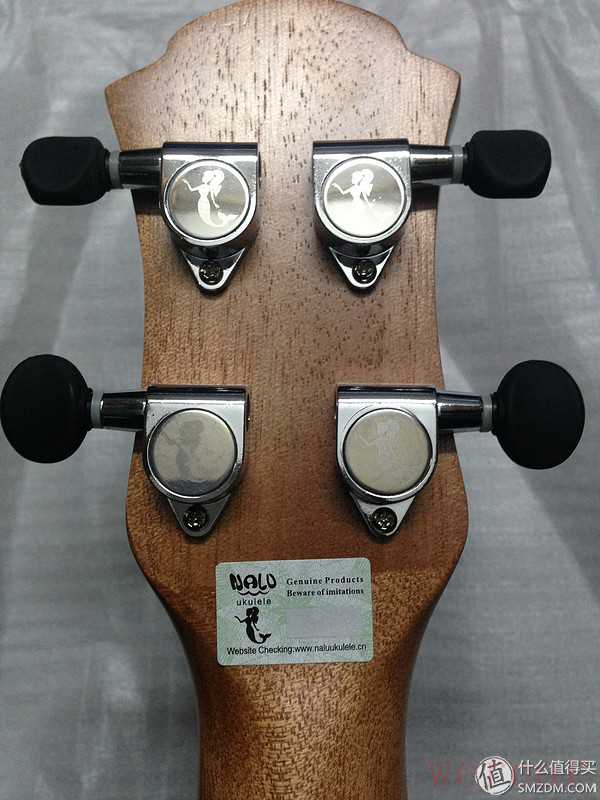 琴头背面,四颗全封闭的琴钮,每颗琴钮上都有美人鱼的标志,塑料外包。还有防伪标,刮开涂层登陆NALU官网可以输入验证琴的真伪。