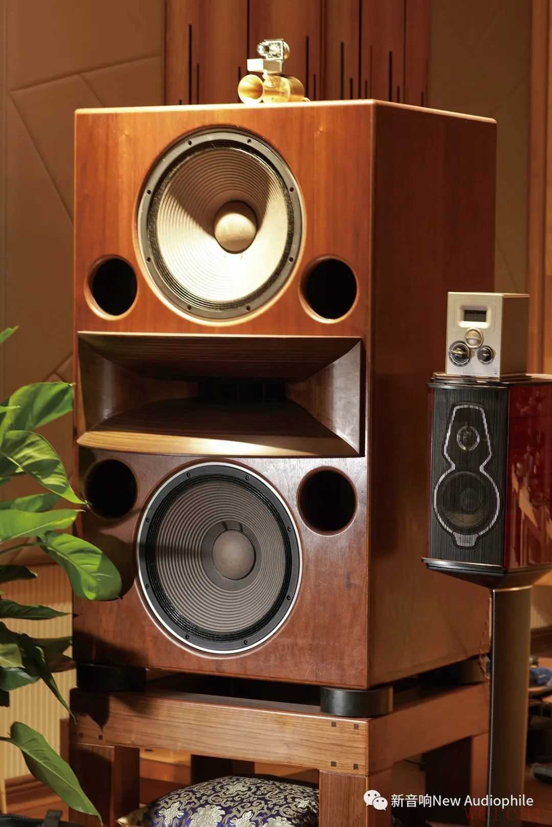 ▲李总原本搭配了西电的古董号角超高音李总自己对这套系统也有意见,他想把音箱、功放全部升级更新,此是后话,我们拜访的目的是希望在现有基础上,进行合理有效的调整。前面说过,财务自由的李总想买甚么都没问题,他经常一个人待在音响房听音乐到深夜,老父亲颇有微词,如果大动干戈势必引发更多不悦,所以更换器材最好从比较不起眼的功放、线材着手。前述几个比较明显的问题,或许可以透过音箱摆位来处理,但每只重150公斤的RM-8V(连订制的木脚架大概有200公斤),实在不容易搬动。而聆听位置后面有张大茶桌,舒适的瑞典Stressless休闲椅似乎也很难前后挪移,必须另外想办法。