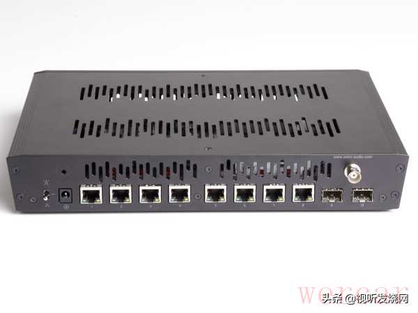 sNH-10G网络交换器,全机采用金属机壳,背后提供8组RJ45网络端口与2组SFP光纤网络端口。