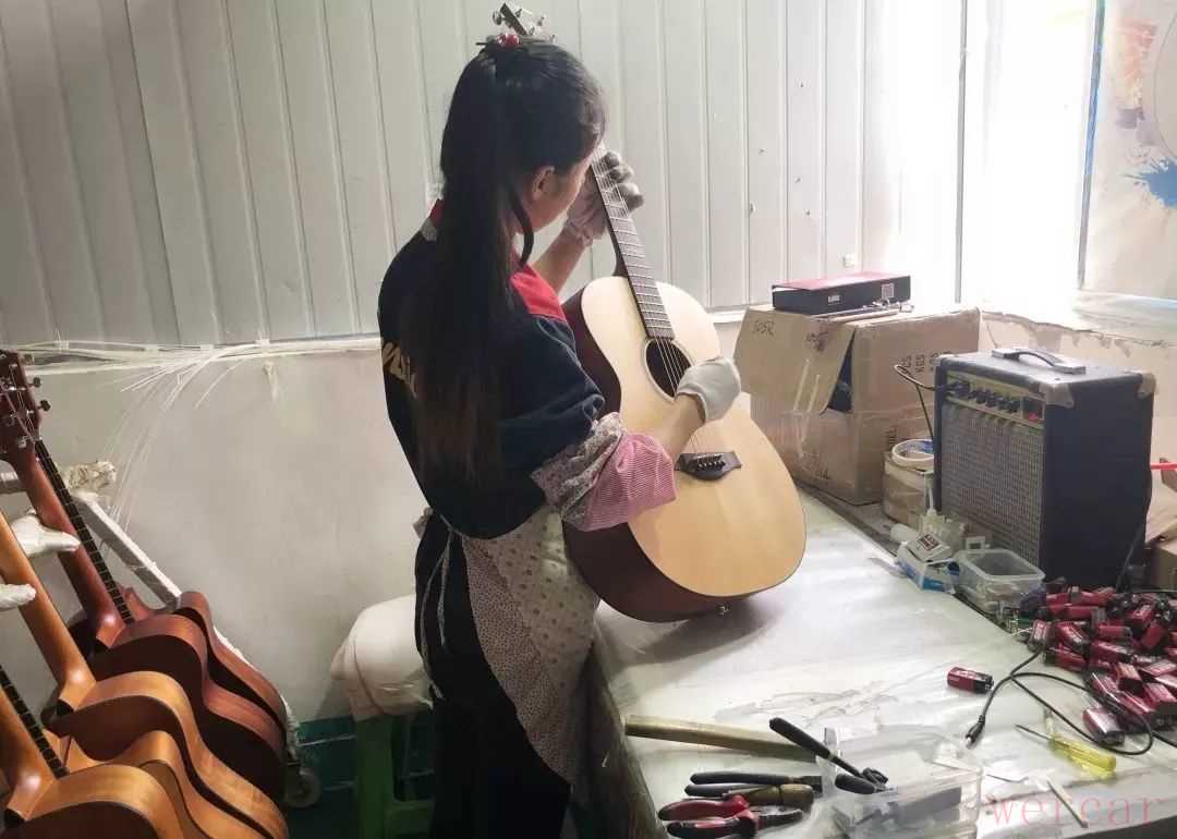 “她们的耳朵很厉害的,比调音器厉害多了。”在一个相对狭小的空间内,另一女工接着音响,熟练地弹拨着手中的吉他弦,时不时在吉他上敲敲打打。